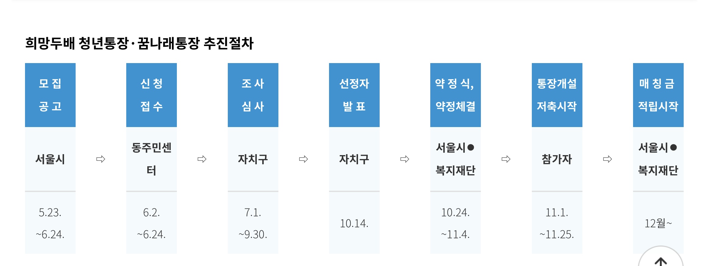 - 최종 대상자 발표 : 자치구 및 서울시복지재단 홈페이지 (http://www.welfare.seoul.kr), 서울시 자산형성 지원사업 홈폐이지 (http://account.welfare.seoul.kr) 에서 2022년 11월 4일(금) 까지 본인이 직접 확인
