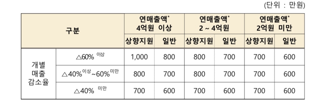 - 개별업체 매출규모 및 매출감소율에 따라 총 9개 구간으로 구분하여 700만원, 800만원 또는 1000만원 지급 합니다