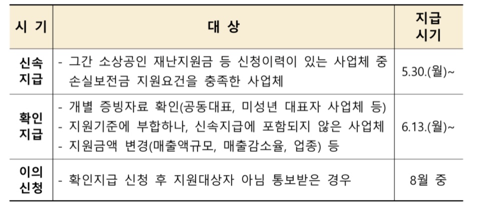 • 대상 : 개별 증빙자료 확인이 필요한 사업체, 손실보전금 지원대상 요건을 충족하면서 신속지급으로 지급받지 못한 사업체, 지원금액(매출액 규모, 매출감소율, 업종 등) 변경등