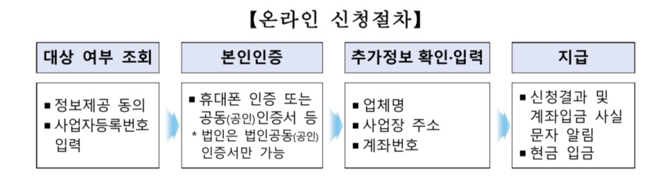 - 신청방법 : 온라인신청으로 진행되며 필요 증빙서류를 누리집에 제출시 소상공인시장진흥공단에서 확인,검증 후 지급여부 결정 합니다