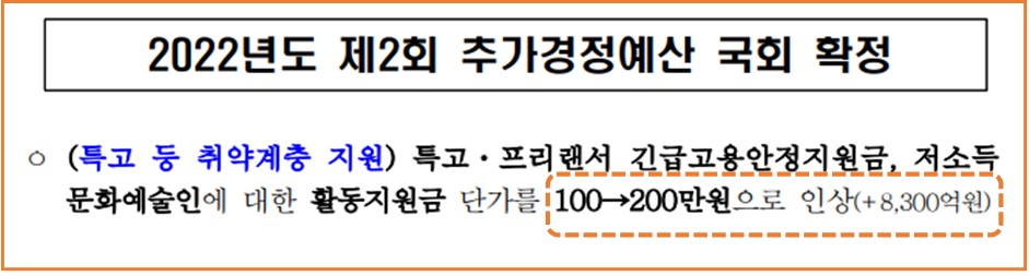 - 특별고용,프리랜서 문화예술인 : 100만원 →200만원 지급