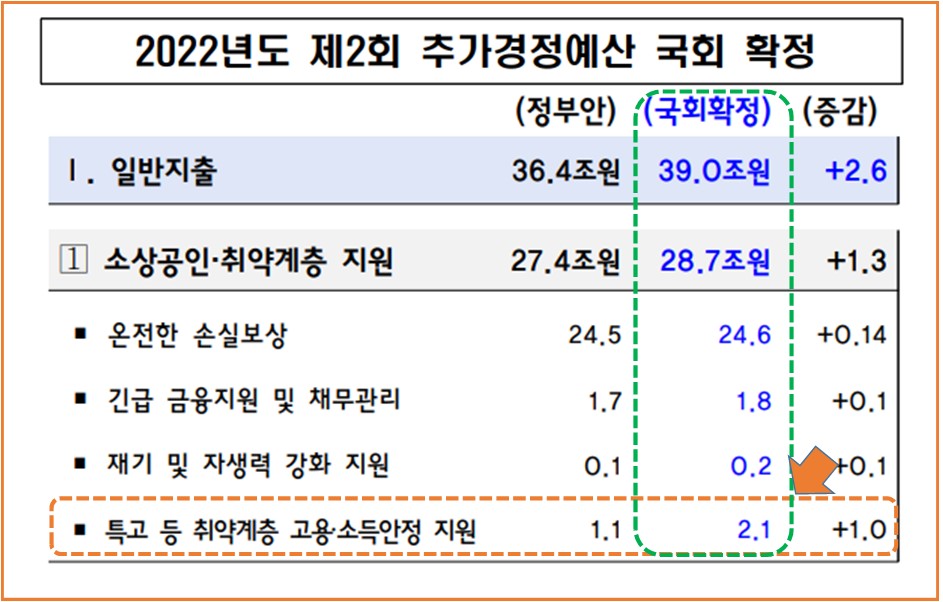 2022년 제 2회 추경 국회확정 내용을 보면 ' 특고 등 취약계층 고용 및 소득안정 지원' 에 배정된 예산이 기존 1조 1천억원에서 2조 1천억원으로 무려 1조원이 증액되었습니다.