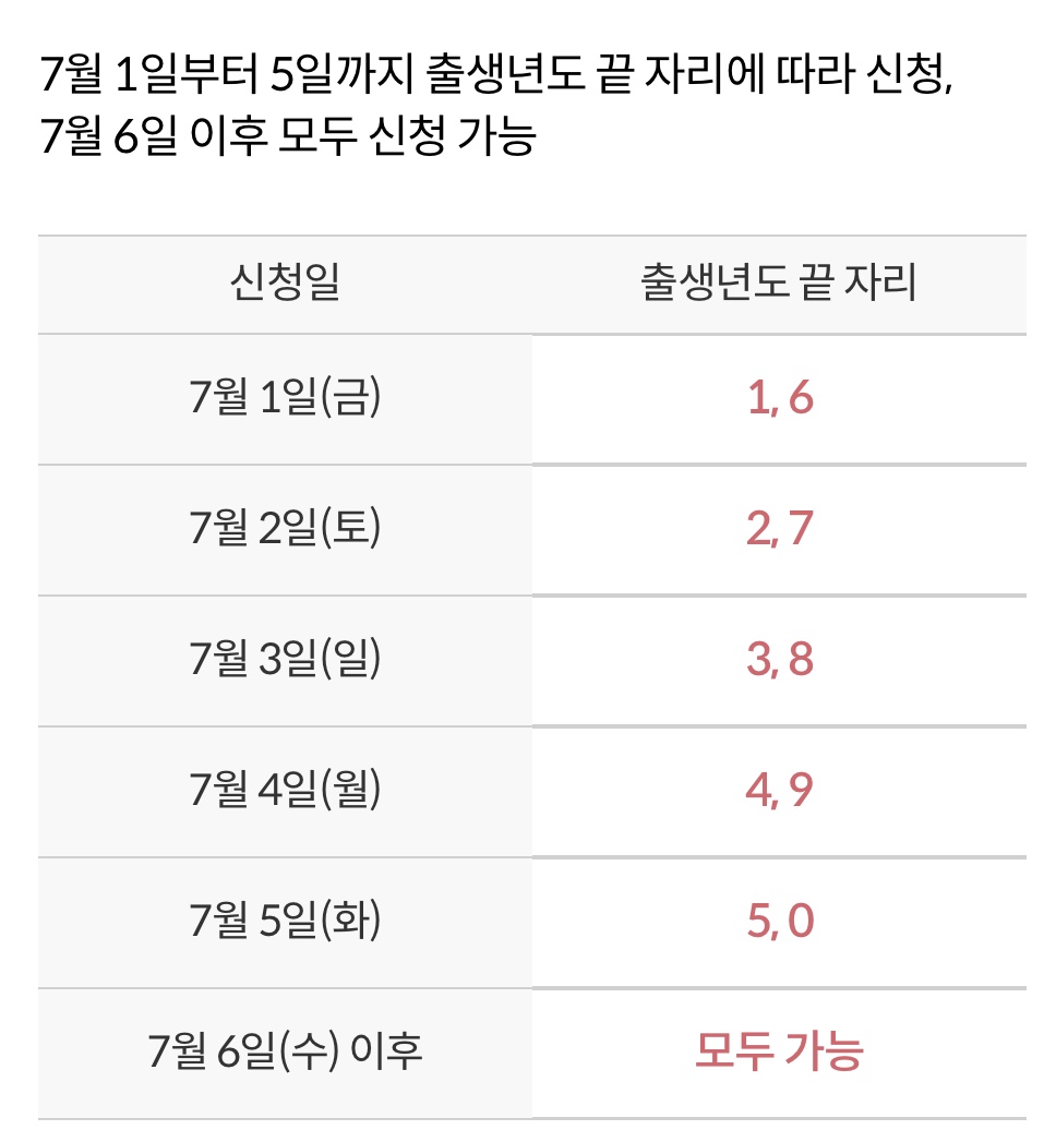- 온라인신청 : 7월1일부터 5일까지 출생년도 끝자리에 따라 5부제 신청, 7월 6일 이후 모두 신청가능