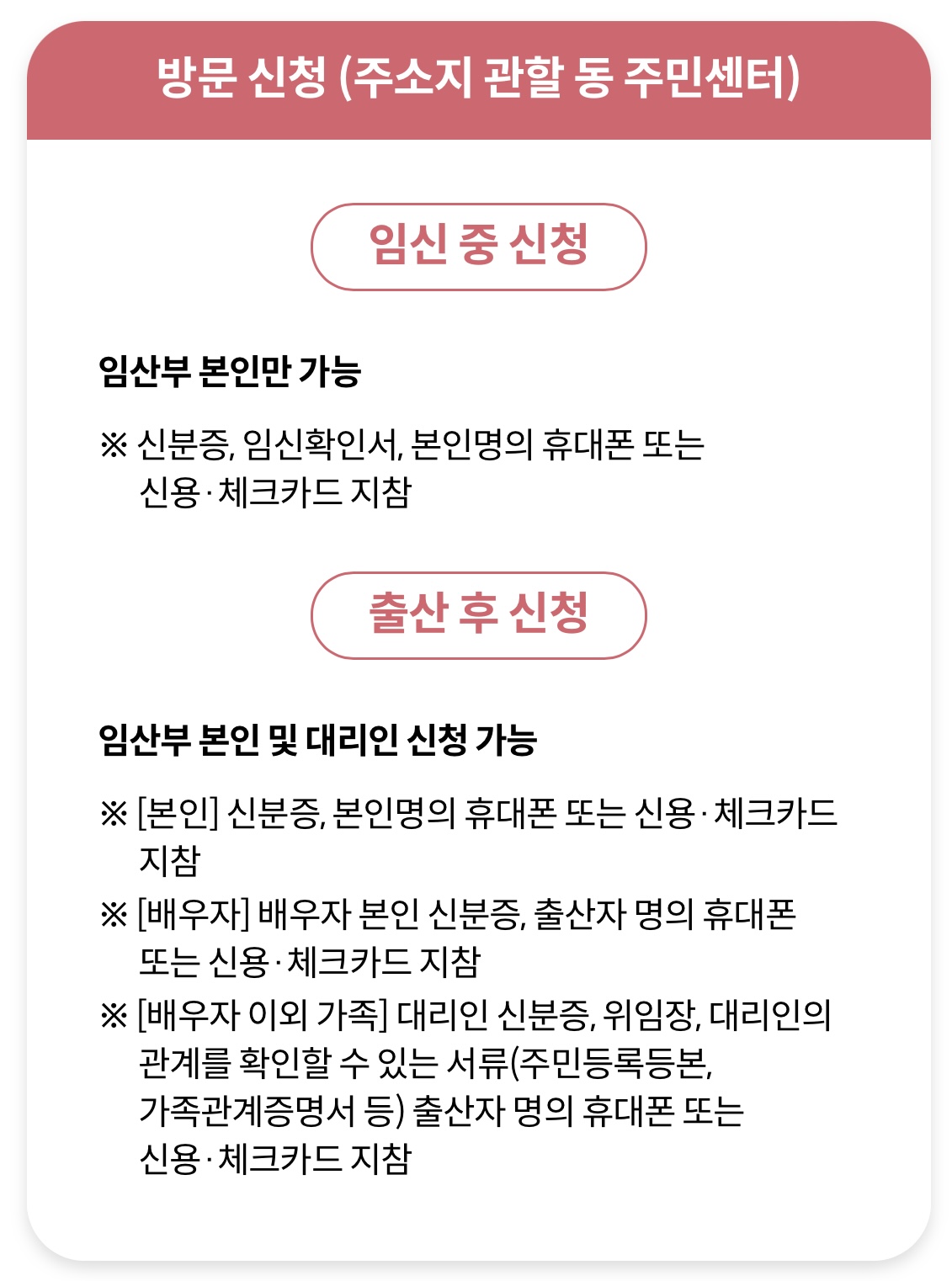 - 출산후 신청일 경우 : 임산부 본인 및 대리인 신청가능