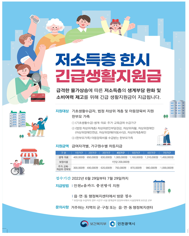 인천시에서 급격한 물가상승에 따른 저소득층의 생계부담을 덜어주고 소비여력을 높이기 위해 지원금을 지급한다고 해서 알려드립니다.