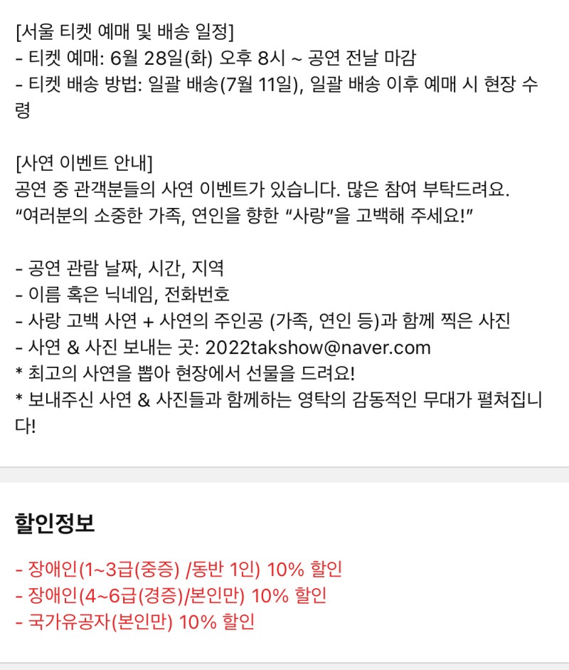 - 공연 중 관객분들의 사연 이벤트가 있다고 하니 참여 하실 분들 준비하셔서 도전하세요!