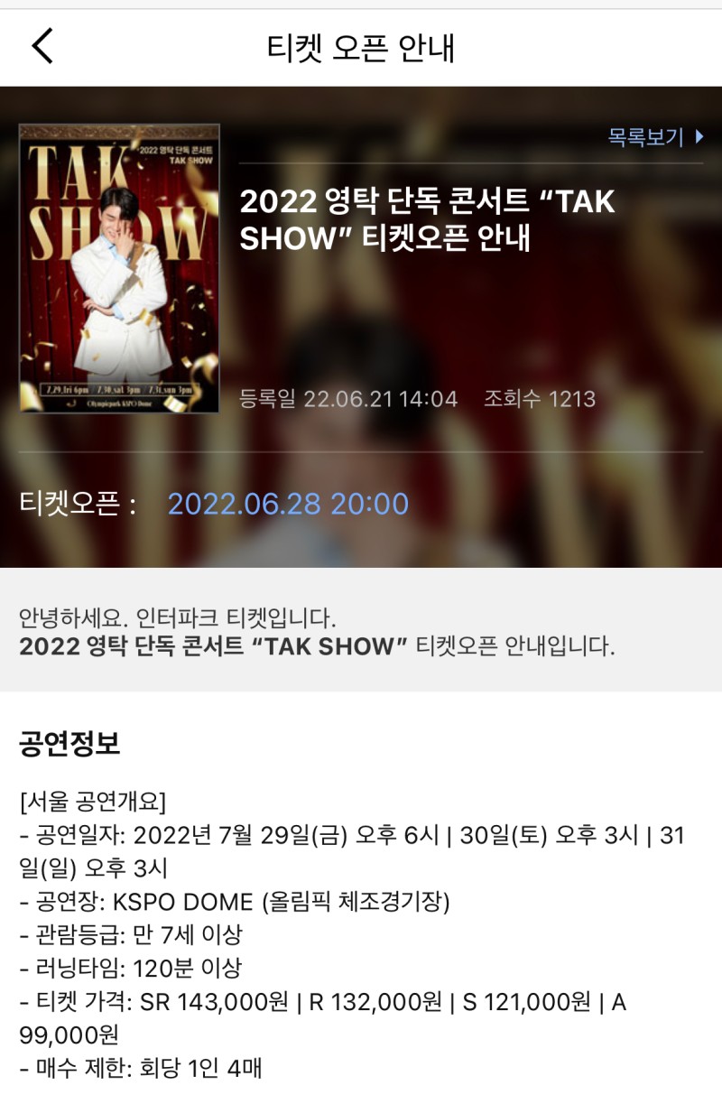 - 티켓 가격 : SR 143,000원 / R 132,000원 / S 121,000원 / A 99,000원