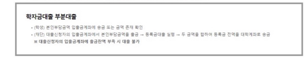 - 단 , 등록금 납부 전인 재학생 대학등록예정자의 경우 금액한도 50만원 및 횟수한도 1회에 한하여 가능하며, 잔여금액은 등ㄹ옥이후 실행가능