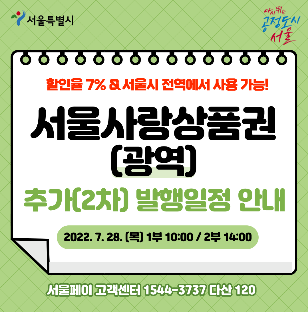지난 7월 14일에 발행된 서울사랑상품권이 빠른시간안에 완판되었습니다. 많은 분들이 접속에 어려움을 겪었고 그로인해 구매에 실패한 분들이 많아서, 이번에 다시 서울사랑상품권 추가 발행을 한다고 합니다.