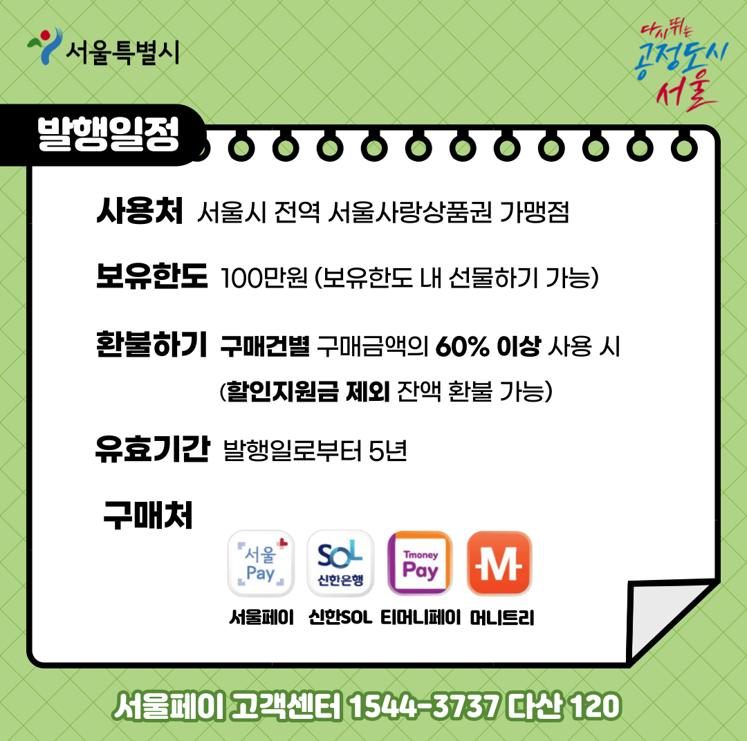 - 구매처 : 서울페이+ 앱 , 신한 SOL , 티머니페이, 머니트리