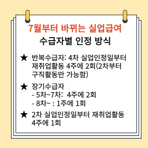 수급인별 인정방식은 세부류로 나누어집니다. 반복수급자인 경우 4차 실업인정일부터 재취업활동을 4주동안 2회 해야하며 2차부터는 구직활동만 가능합니다. 그리고 장기 수급자인 경우는 조금 더 까다롭게 변경되는데 실업인정일에 따른 재취업활동의 기준이 5~7차까지는 구직활동 1회 포함하여 4주동안 2회 하셔야 하며, 8차 이후로는 매주 1회 구직활동을 하여야 합니다.