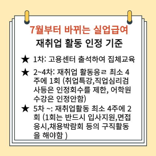 재취업인정기준의 변경사항도 차수에 따라 달라지는데 1차의 경우는 고용센터에 출석을 하여 집체 교육을 받게 되고 1,2,.3,4차 의 경우 재취업활동을 최소 4주에 1회는 해야하고 5차의 경우는 4주에 2회로 늘어나게 됩니다.