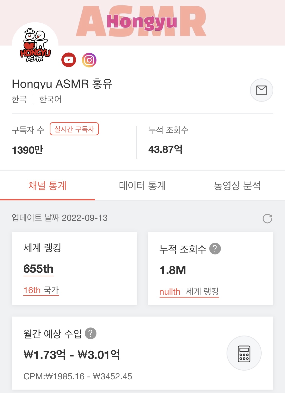 | 16위 | Hongyu ASMR 홍유 |