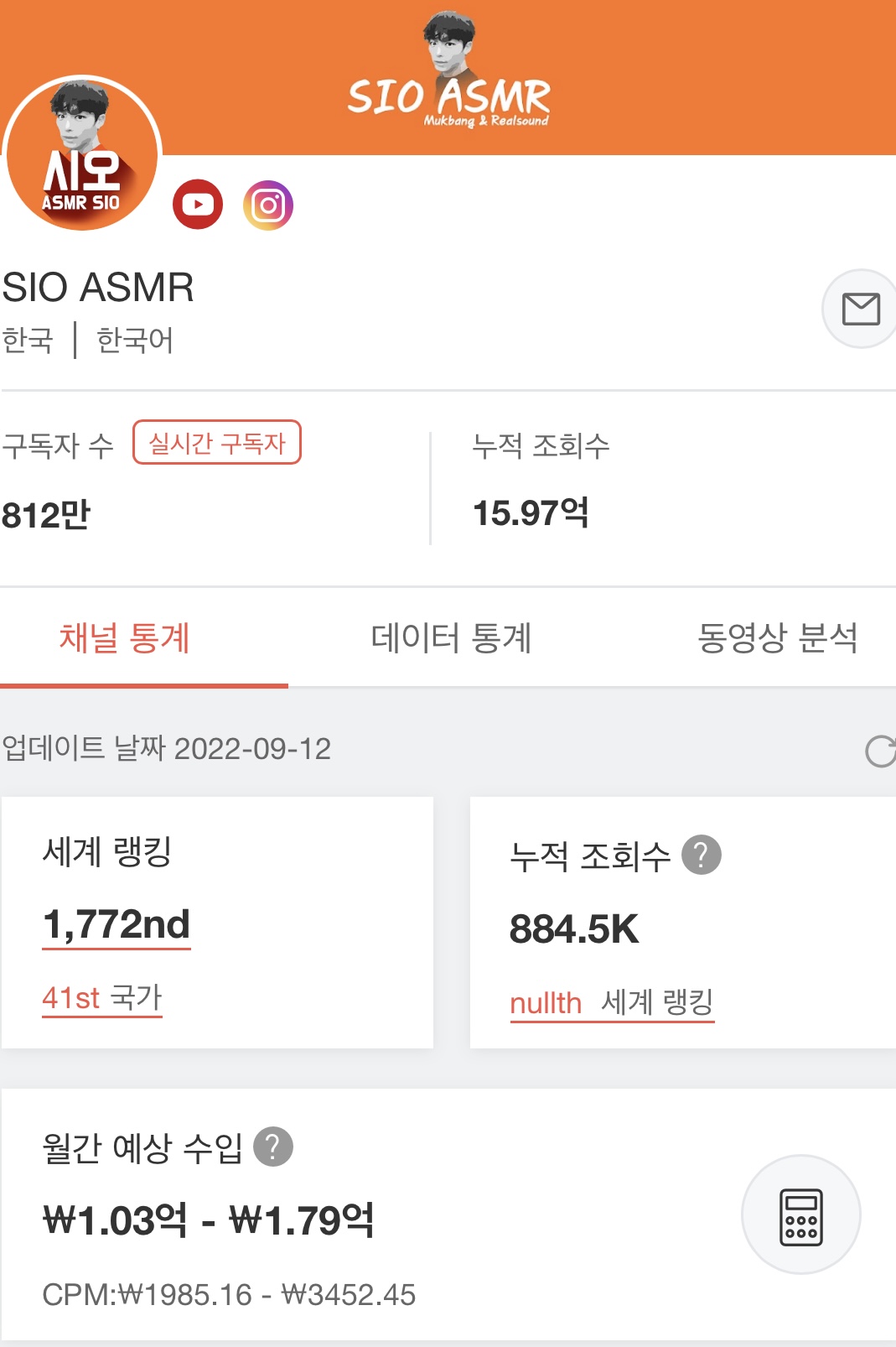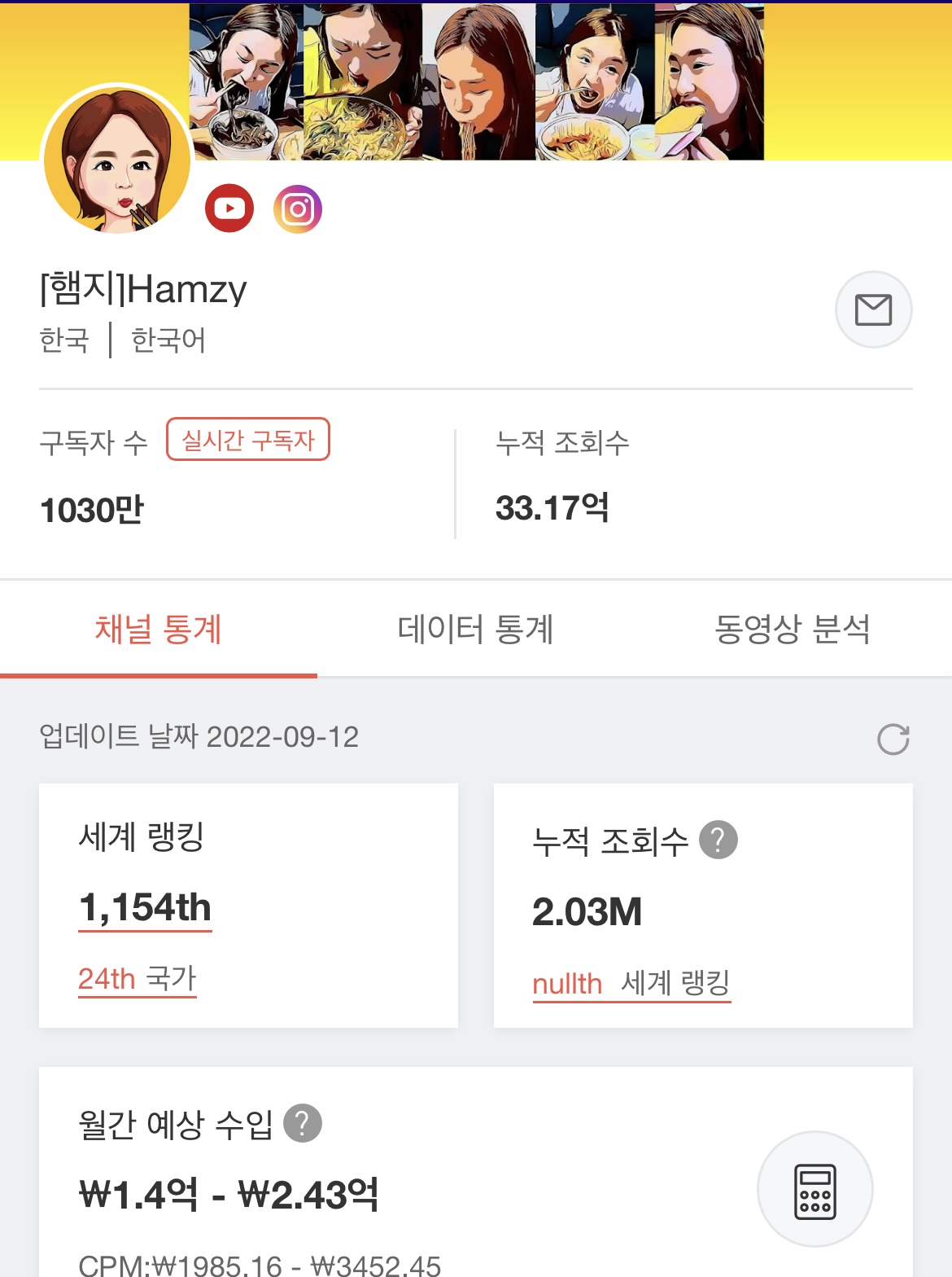 화재의 먹방 유튜버 월간 예상 수익