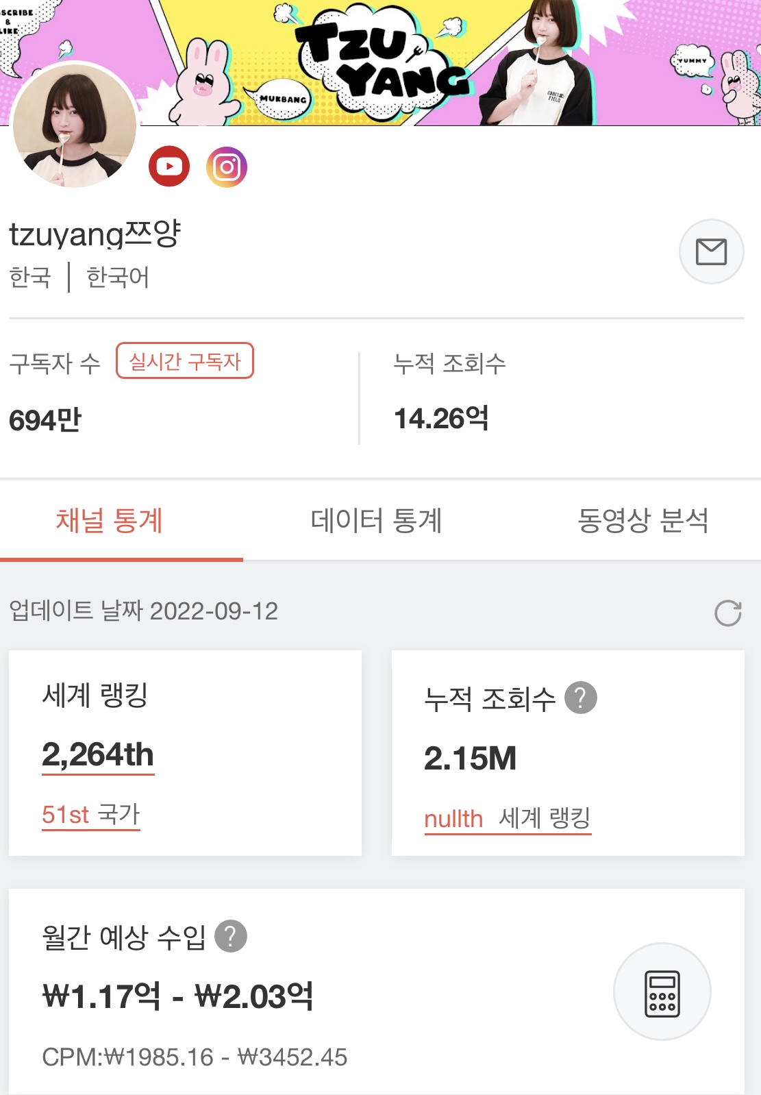 사진처럼 보시는 것처럼 유튜브 뿐만 아니라 인스타그램 팔로워 순위 틱톡 팔로워 순위 트위치 팔로워 순위까지 보실 수 있으며, 수인계산기를 클릭하시면 해당 유튜버나 인플루언서의 예상 수익도 알 수 있습니다.