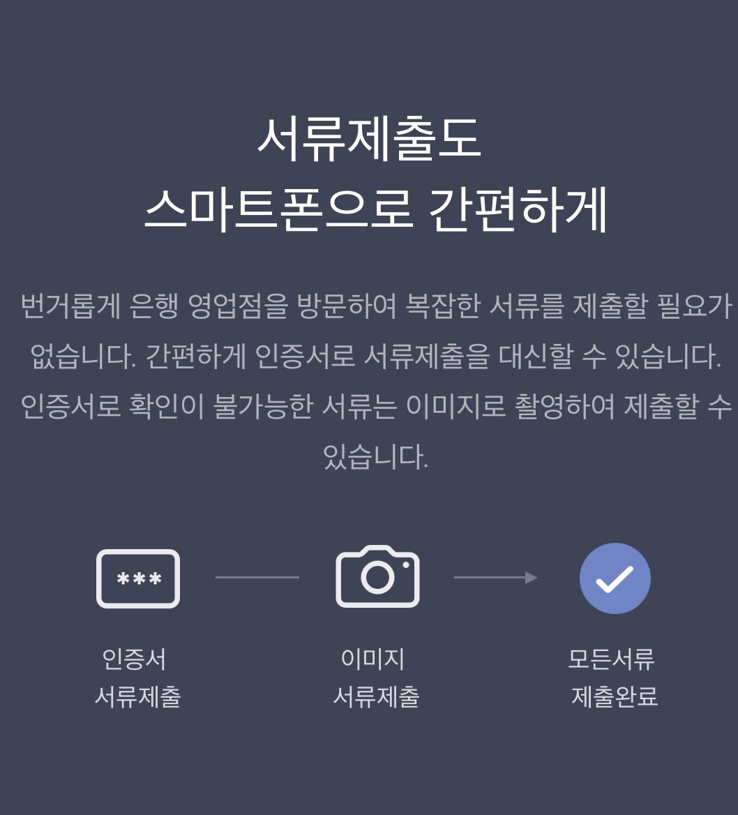- 번거롭게 은행 영업점을 방문하여 복잡한 서류를 제출할 필요없이. 간편하게 인증서로 서류제출을 대신할 수 있습니다.인증서로 확인이 불가능한 서류는 이미지로 촬영하여 제출할 수 있습니다.