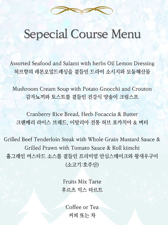 -식사는 공연 회차별로 1시간 정도 진행되며 양식 코스로 제공됩니다.