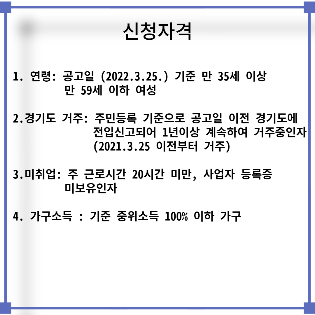 공고일 기준 만 35세 이상 만 59세 이하이며 경기도에서 1년이상 거주한 여성으로 주 20시간 미만 근로자이거나 , 사업자 등록증을 미보유 한 기준 중위소득 100% 이하의 여성인 분이라면 신청할 수 있습니다.