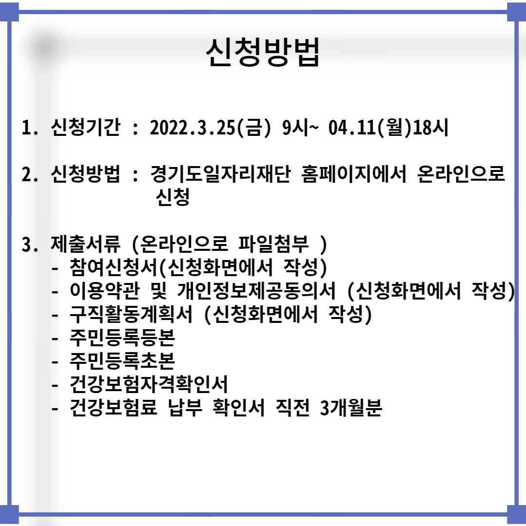 2022년 3월 25일 부터 4월 11일 까지 경기도 일자리 재단 홈페이지에서 온라인으로 신청가능합니다.