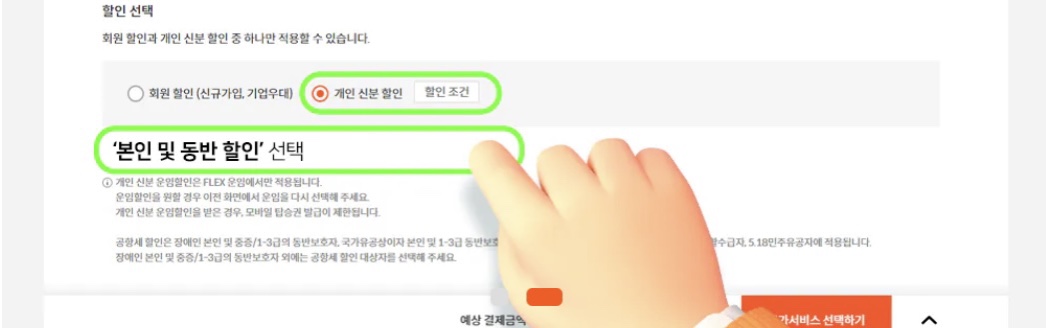 ② 탑승객 정보 입력시 개인신분할인 >본인및 동반할인 을 선택합니다.