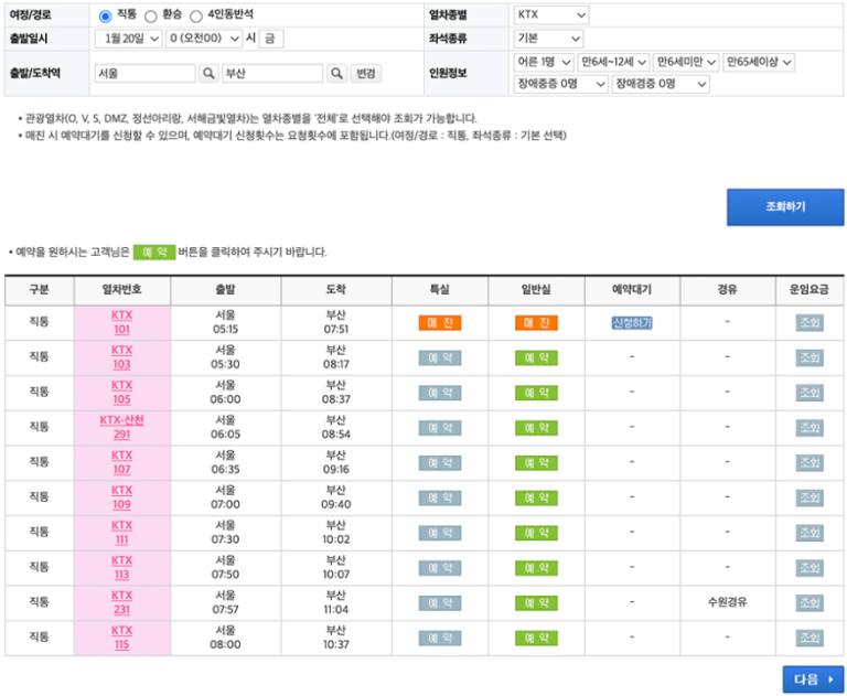 일자,시간,구간,인원수를 입력한 후 조회하기 버튼을 눌러서 열차를 조회합니다.