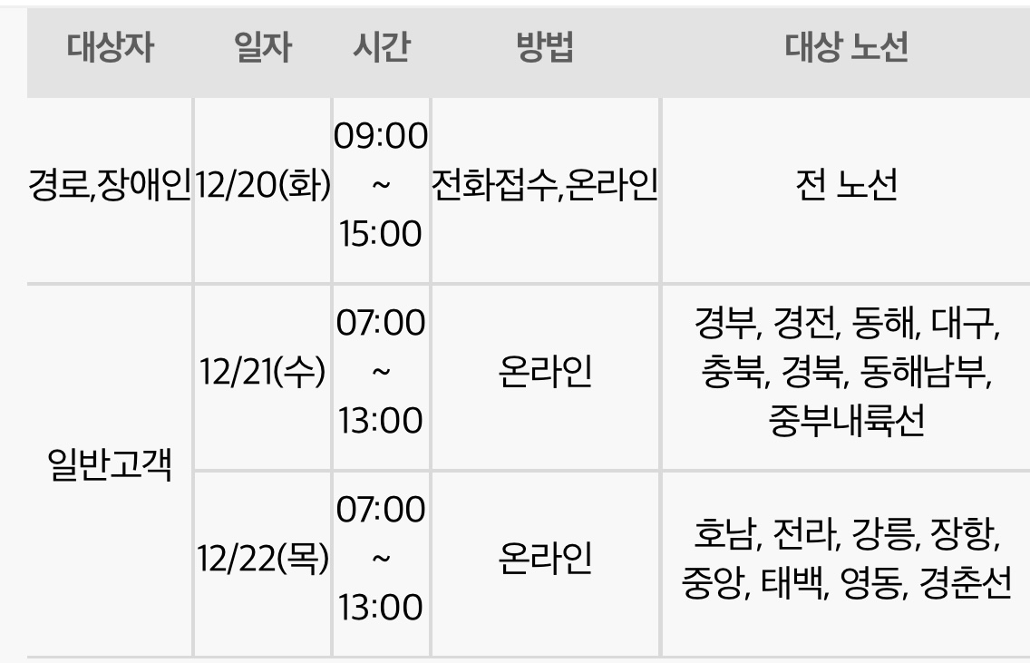 한국철도공사(코레일)는 2023 년 설날 기차표를 12월 20일 부터 22일까지 3일간 판매한다고 밝혔습니다.