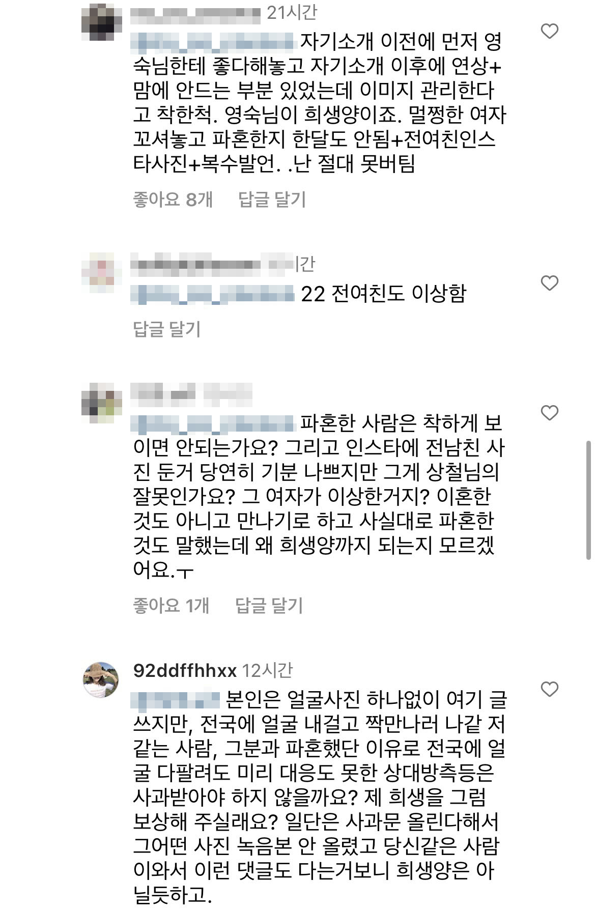 영숙은 22일 자신의 개인 계정에 한 네티즌이 남긴 댓글에 솔직한 반응을 보였습니다. 한 네티즌이 상철의 파혼 등과 관련된 논란을 언급하자 이에 대한 생각을 밝힌 인데, 네티즌은 "파혼한 사람은 착하게 보이면 안 되나요? 인스타에 전 남친 사진 둔 것 당연히 기분 나쁘지만, 그게 상철 님 잘못인가요? 이혼한 것도 아니고, 만나기로 하고 사실대로 파혼한 것도 말했는데 왜 희생양까지 되는지 모르겠다"고 한것에 대해 영숙은 "본인은 얼굴 사진 하나 없이 여기 글 쓰지만, 전국에 얼굴 내걸고 짝 만나러 나간 저 같은 사람, 그분과 파혼했다는 이유로 전국에 얼굴 다 팔려도 미리 대응도 못한 상대방 측 등은 사과받아야 하지 않을까요? 제 희생을 그럼 보상해주실래요? 일단은 사과문 올린다 해서 그 어떤 사진, 녹음본 안 올렸고 당신 같은 사람이 와서 이런 댓글도 다는 것 보니 희생양은 아닐 듯 하고"라고 강한 어조로 지적했습니다.