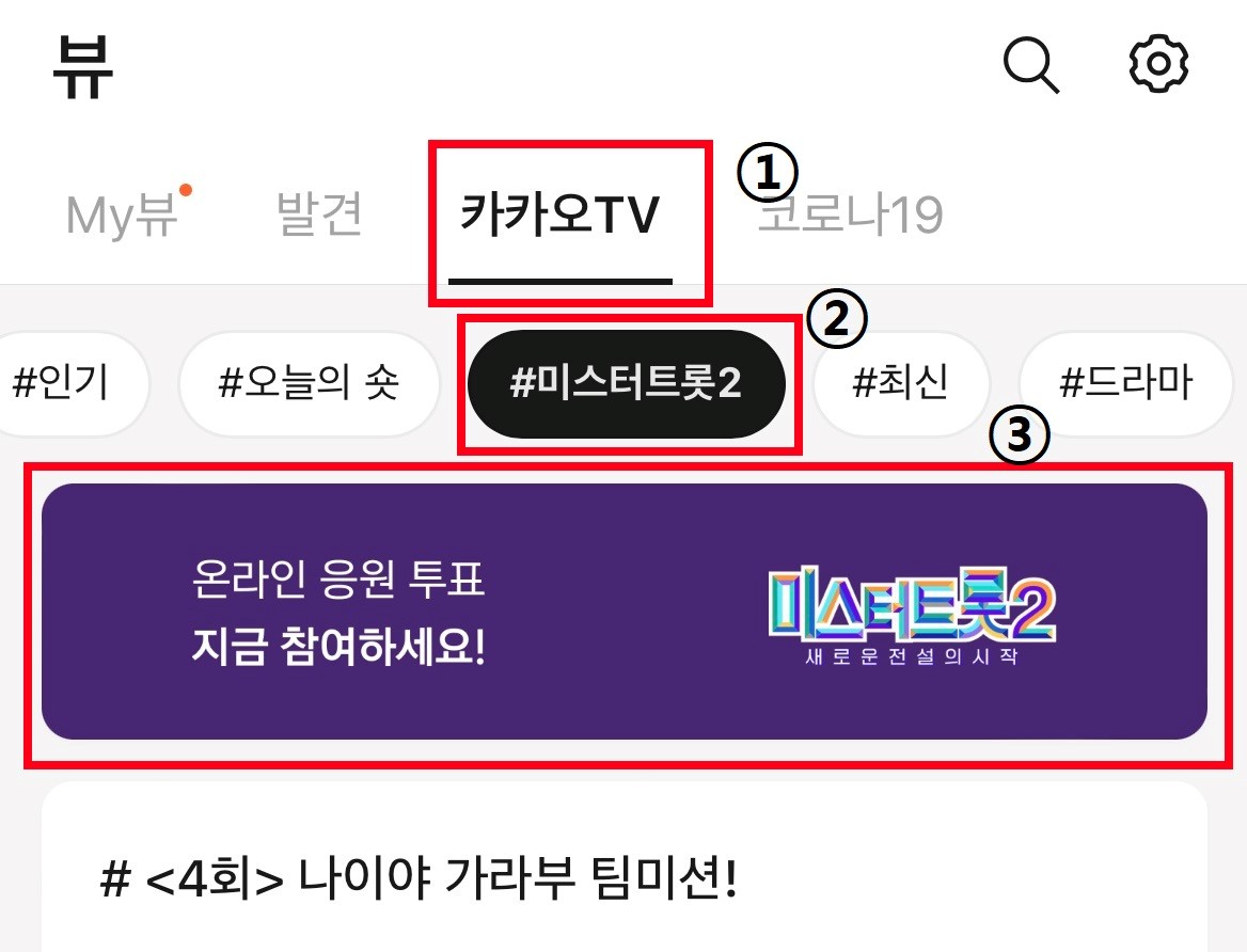 3) 제일 위에 상단 카카오TV 상단 메뉴에서 #미스터트롯2 배너 선택 합니다.