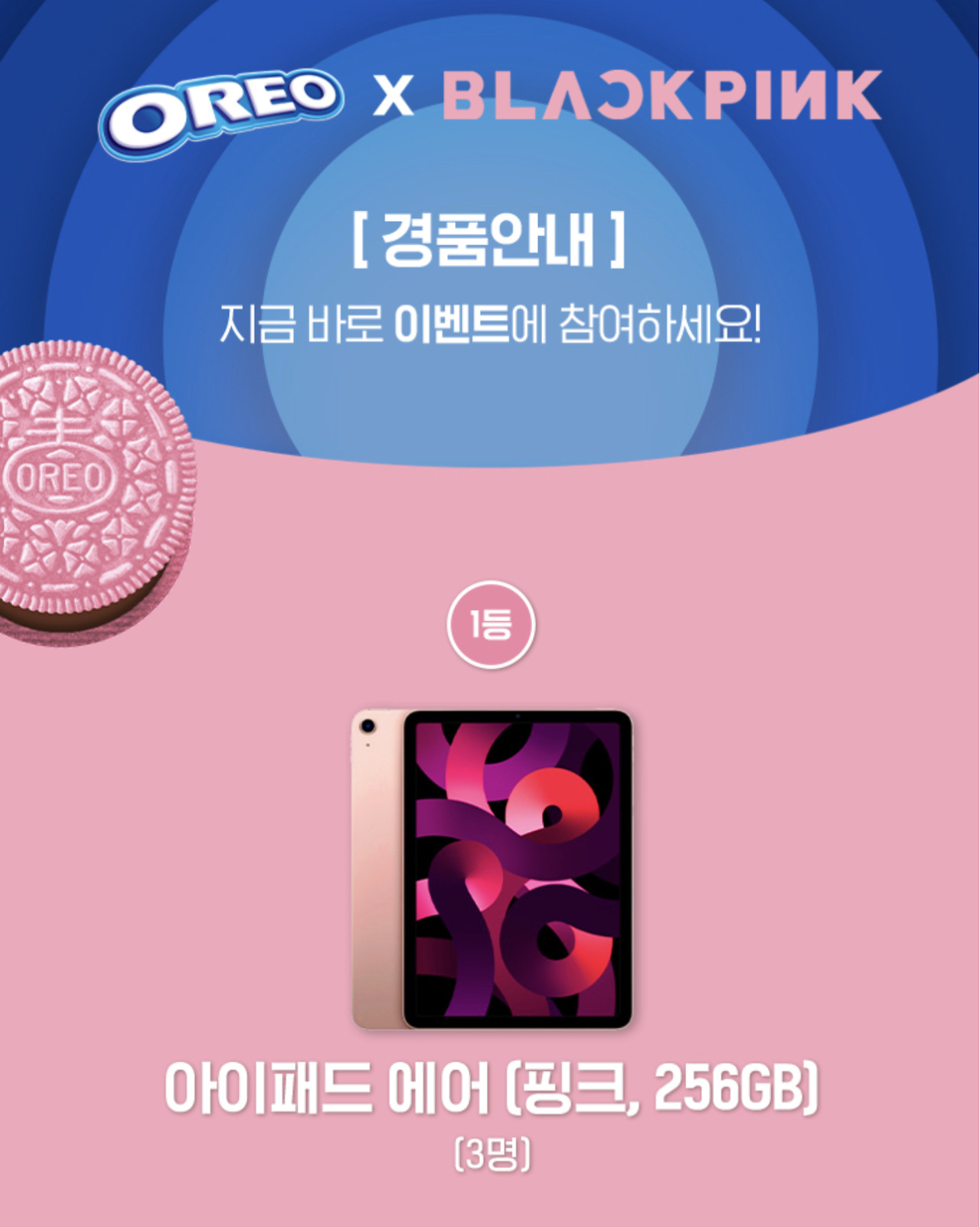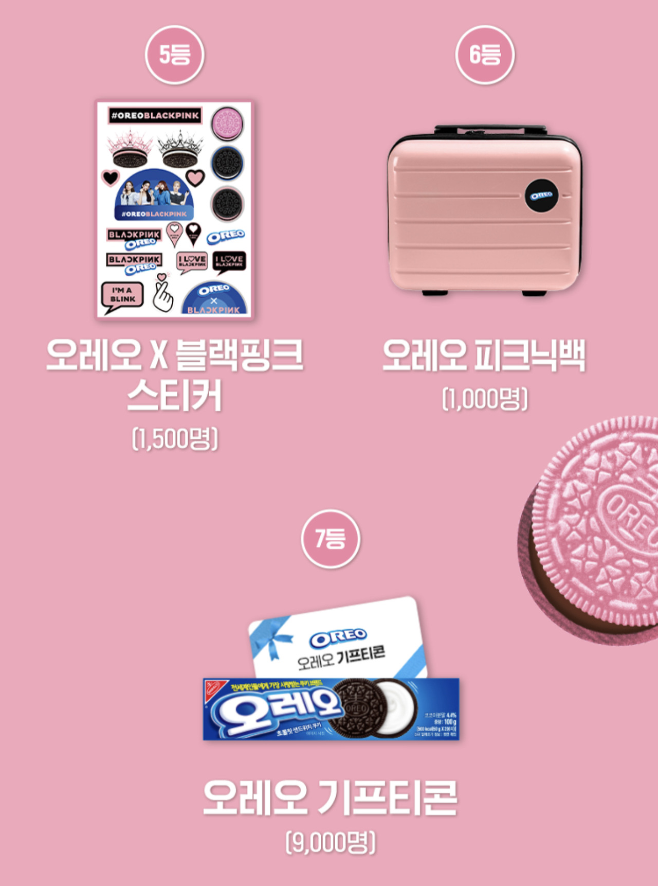 1등 아이패드 에어 (3명) , 2등 굿즈 4종 + 오레오 포토카드 (1500명), 3등 블랙핑크 PVC백 (1500명) , 4등 오레오 포토카드 (8500명) , 5등 오레오 * 블랙핑크 스티커 (1500명) 6등 오레오 피크닉백 (1000명) , 7등 오레오 기프티콘 (9000명 )