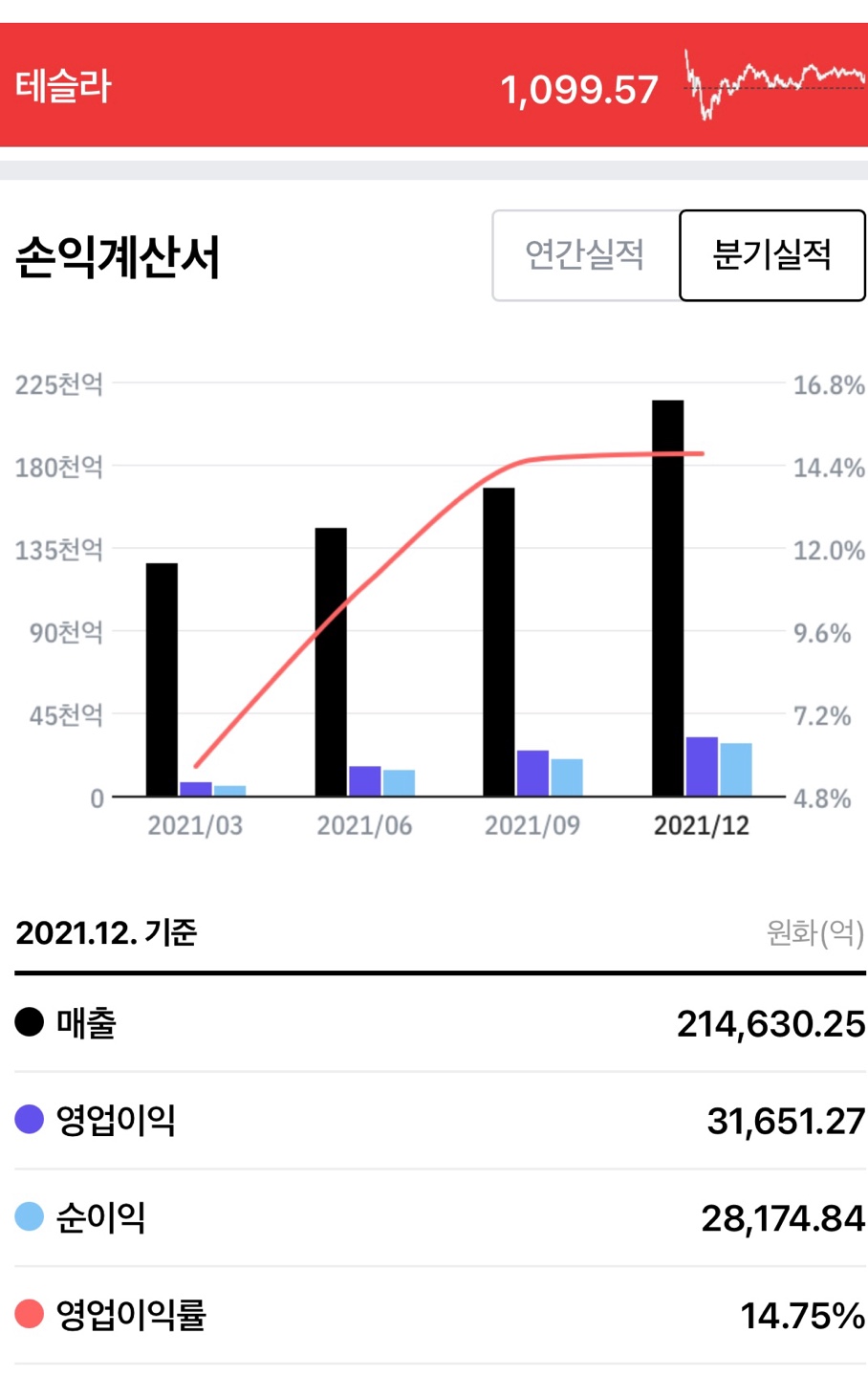 테슬라의 연간 손익계산표를 보면 매출의 상승세가 가파를 정도로 엄청납니다. 21년 매출총액은 $54.0B 를 넘어섰습니다.2020년부터 흑자로 돌아선 순이익도 2021년에는 $5.0B 를 넘어설정도로 빠르게 성장중이구요.
