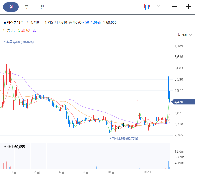 2월 22일 휴맥스 홀딩스도 장 시작과 동시에 상한가로 직행한 뒤, 5,080원에 마감하기도 하였으며 , 휴맥스 홀딩스 또한 2월 27일 장중 4400원대까지 떨어지며 숨고르기를 하는 모습입니다.