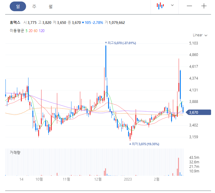 2월 22일 휴맥스 홀딩스도 장 시작과 동시에 상한가로 직행한 뒤, 5,080원에 마감하기도 하였으며 , 휴맥스 홀딩스 또한 2월 27일 장중 4400원대까지 떨어지며 숨고르기를 하는 모습입니다.