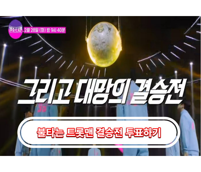 MBN 예능 '불타는 트롯맨' 이 단 2주 방송 만을 남겨두고 마지막 결승전이 2월 28일 오후 9시 40분 부터 생중계로 방송됩니다.