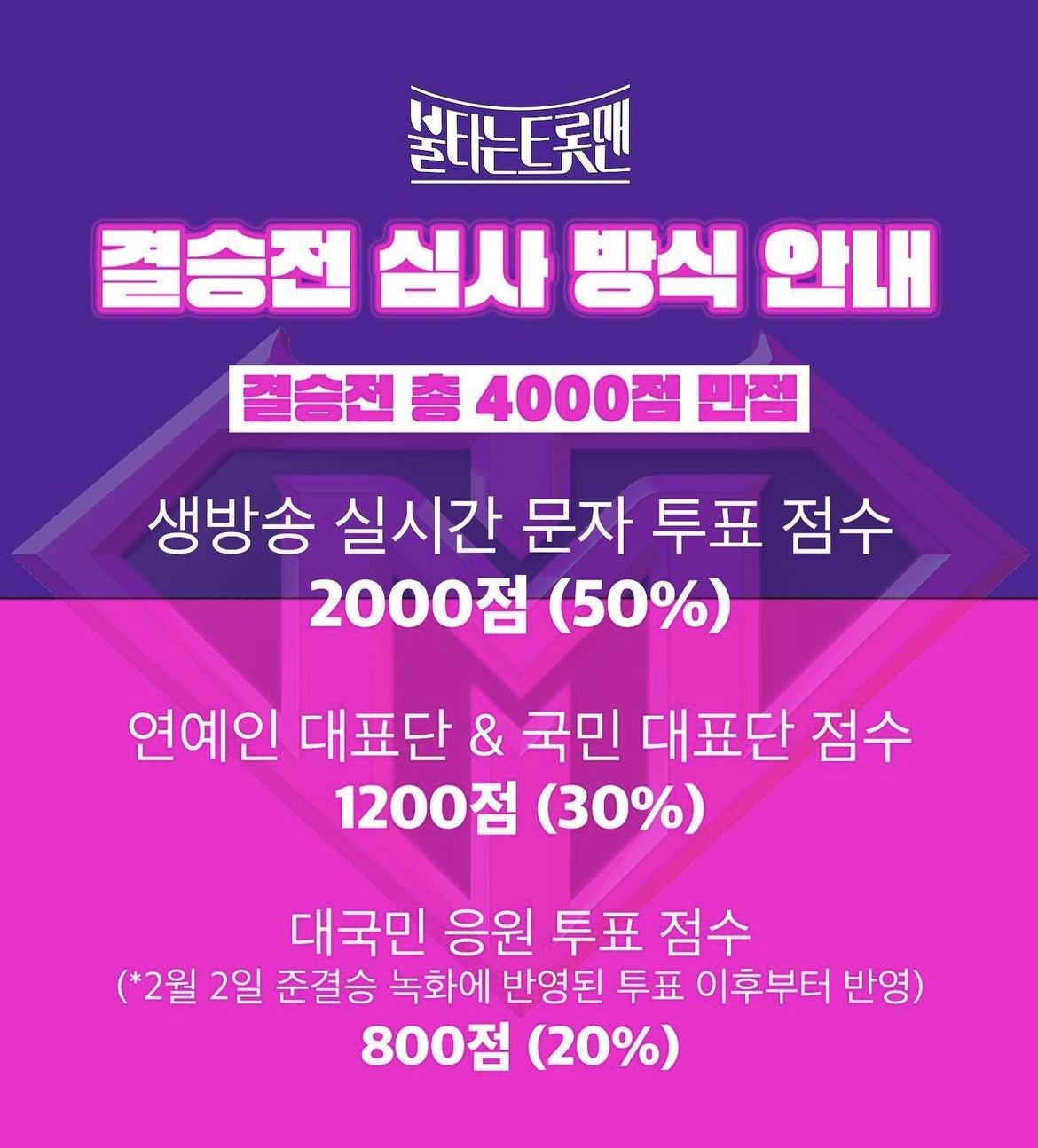 불타는 트롯맨 결승전은 2회에 나뉘어 방송되며 총 4000점 만점으로 채점 됩니다.