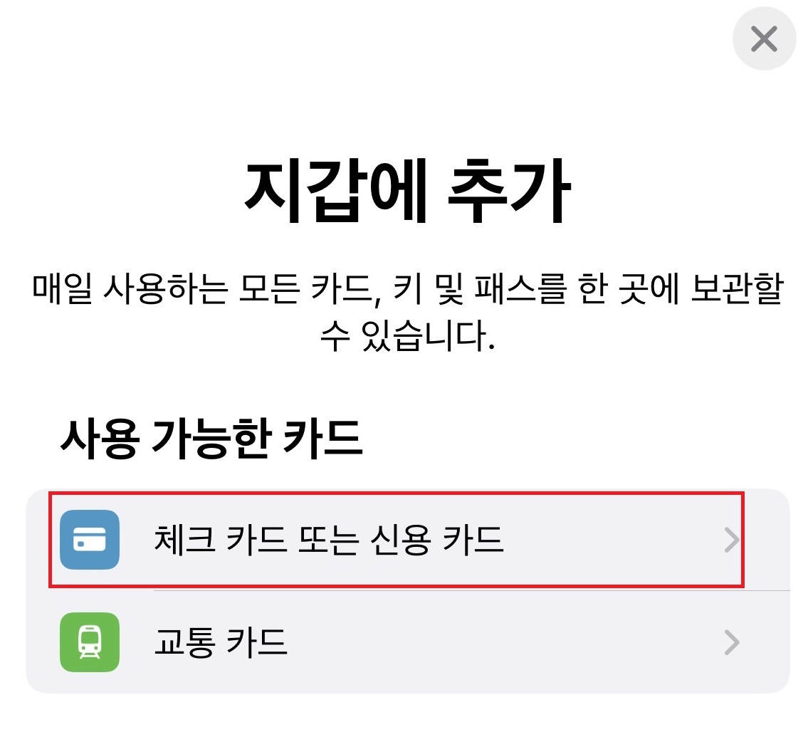 3) 지갑에 추가 부분에서 체크카드 또는 신용카드를 클릭합니다.