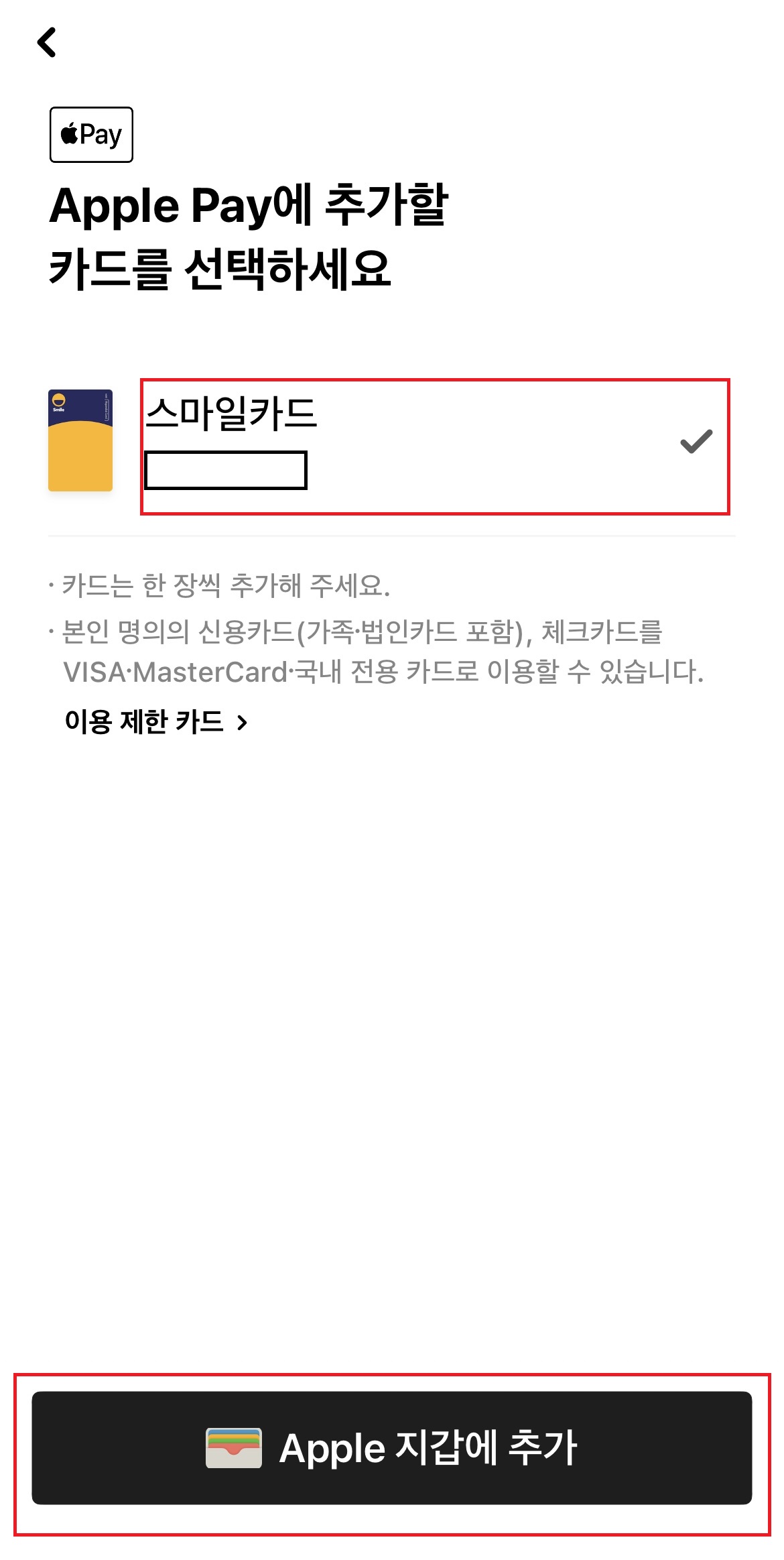 카드를 클릭하여 " apple 지갑에 추가" 를 클릭하면 등록이 됩니다.