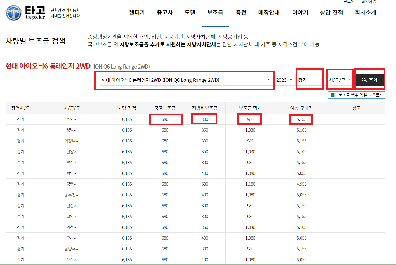 타고라는 홈페이지에 들어가시면 내가 구매하려는 차를 선택 후에 내가 사는 곳을 선택하면 차량가격, 국고보조금, 지자체별 보조금 까지 나와 최종 차량 예상 구매가를 확인 하실 수 있습니다.
