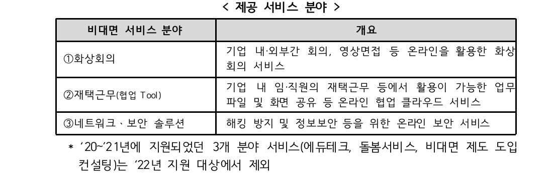- 수요기업이 바우처를 지급받아 'K-비대면 바우처 플랫폼) 에 등록된 서비스 상품을 선택후 결제하고 이용 서비스 제공 분야