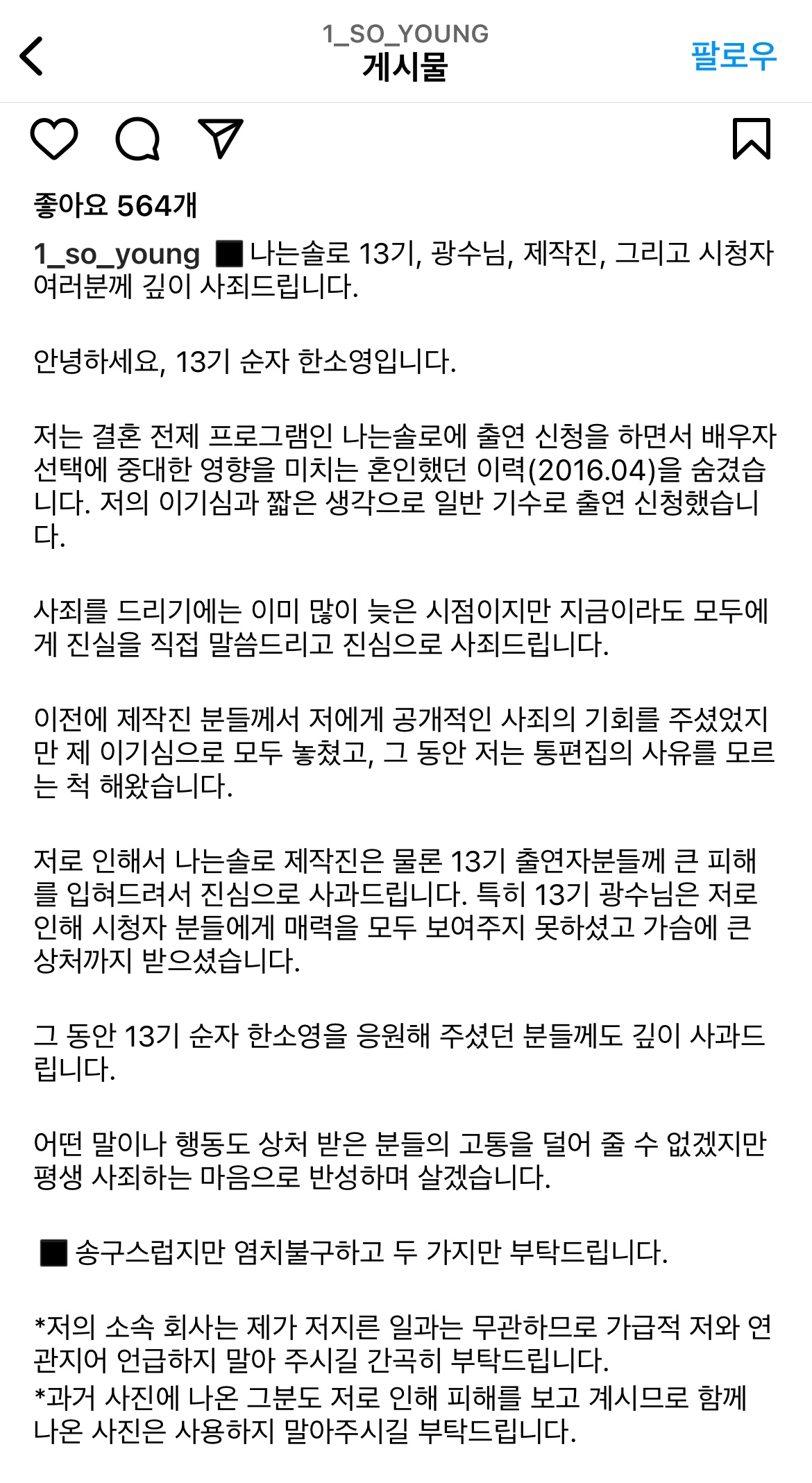 이로인해 나는 솔로 제작진들은 나는 솔로 13기 순자에게 직접 해명할 기회를 준 것 같은데,, 순자는 방송이 끝날때까지도 그 기회를 거절한 것 같습니다.