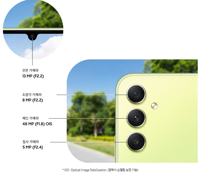 갤럭시 A34 의 카메라 성능은 후면카메라는 3개의 렌즈가 탑재 되었지만 플래그십과 다르게 망원 렌즈 대신 접사 렌즈가 들어갔습니다. 나머지 광각,초광각은 플래그십과 동일합니다.