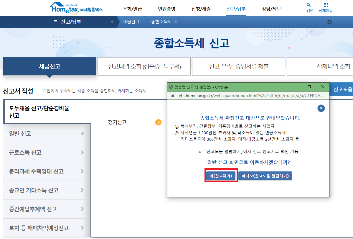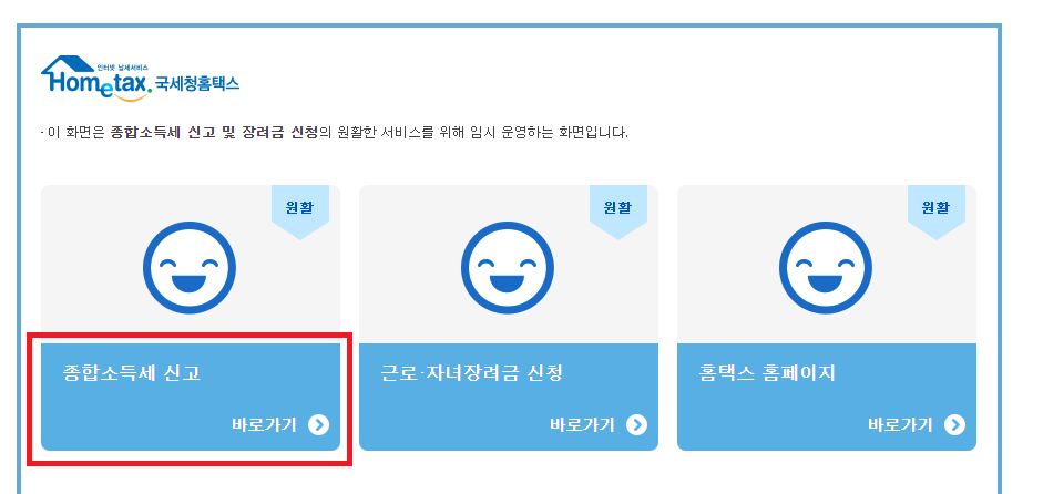 1) 국세청 홈택스 홈페이지에 접속합니다. 종합소득세 신고 를 클릭합니다
