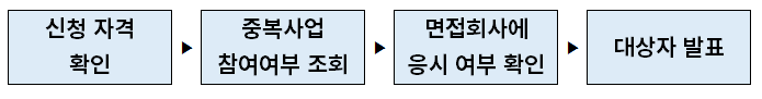 신청자격 확인 > 중복사업 참여여부 조회 > 면접회사에 응시 여부 확인 > 대상자 발표
