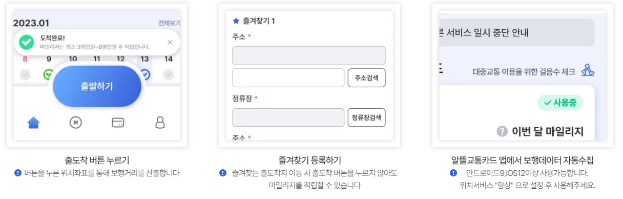 ▶출도착 버튼이나 걸음 수 측정으로 마일리지를 적립 할 수 있습니다.