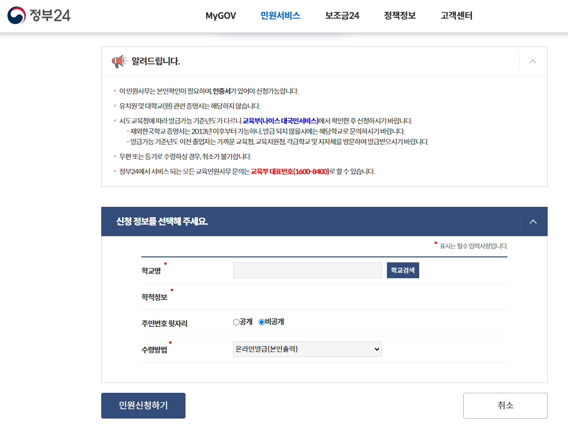 생활기록부는 정부24 공식홈페이지에서 간단하게 발급 받을 수 있습니다.