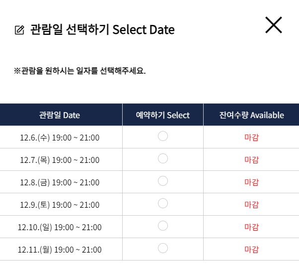 하지만 2023년 12월 8일 전타임 마감으로 나오는데요, 취소표가 간간히 나오고 있으니, 꼭 가보고 싶으신 분들은 계속해서 홈페이지 방문하셔서 취소표를 확인하시길 바랍니다.