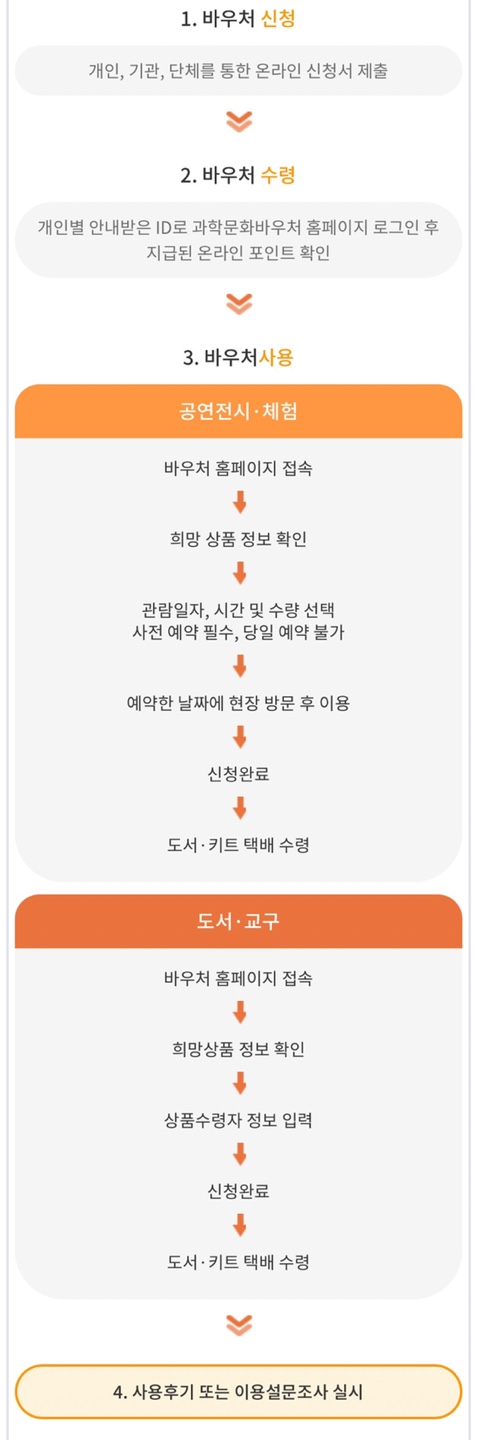 - 신청자격을 갖춘 개인 및 기관이 과학문화바우처 온라인 시스템에 직접 신청