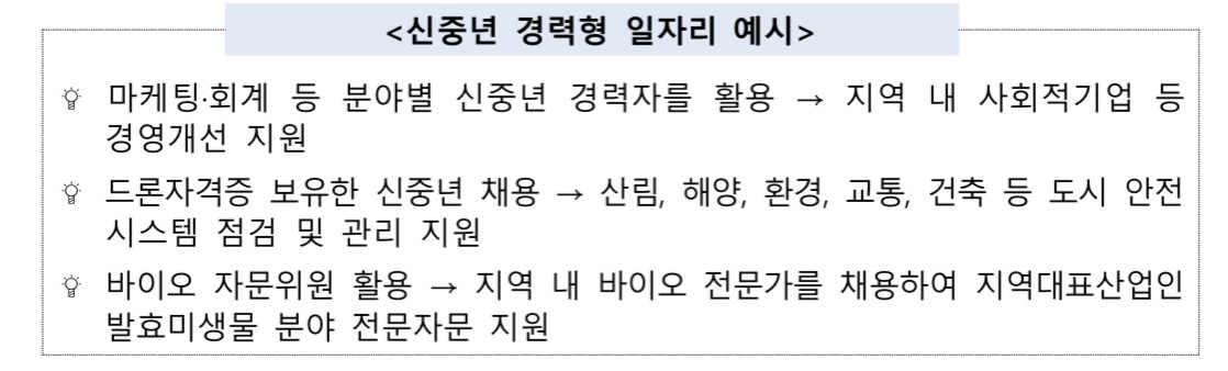 사업 소개 장년 신중년 경력형 일자리 사업 사업 소개 신중년 경력형 일자리 사업 만 50세 이상 70세 미만 퇴직전문인력에게 경력과 전문성을 활용해지역사회에 도움을 제공할 수 있는 공공일자