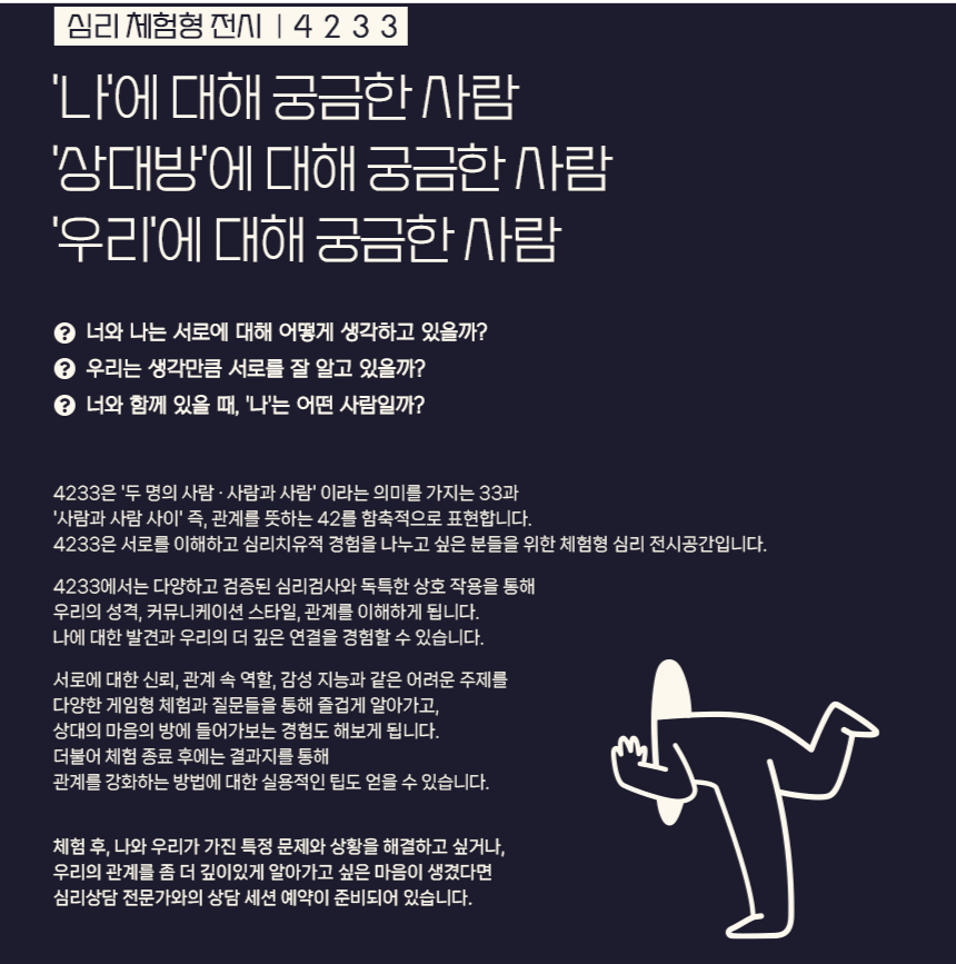 체험 후 상대방과 해결되지 않는 심리적인 문제가 있거나, 조금 더 깊이 있는 상담이 필요하다면 심리상담 전문가와 심리상담예약 후 이용할 수 있다니, 꼭 연인이 아니더라도 부모님과 문제가 있거나, 친구와 문제가 있다면 이번 기회에 함께 방문하여 상대방의 마음도 자세히 알아보고 이해하고 상담까지 받아 보는 것도 좋지 않을 까 싶습니다.