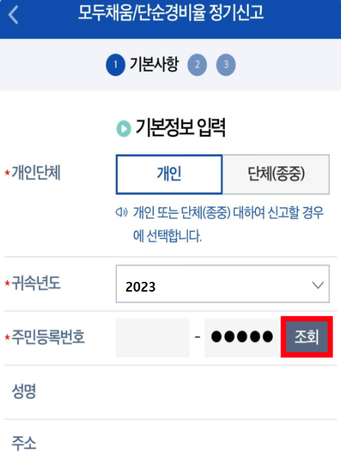납세자 주민번호 뒷자리를 포함한 인적사항을 입력한 후 신고 버튼을 누르면 완료 됩니다.