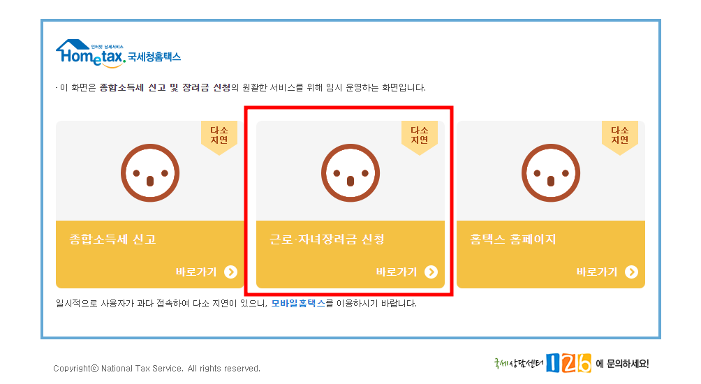 1) 홈택스에 접속합니다. 5월 1일 부터 신청이 시작되어 초반에는 접속에 시간이 걸릴 수 있습니다. 근로,자녀장려금 신청을 클릭하면 다음으로 넘어갑니다.